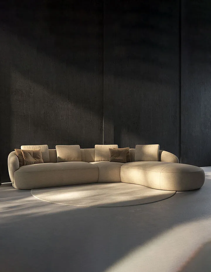 Sofa TORINO vereint einladenden Komfort mit eleganten Proportionen. Die ovale, geschwungene, ja organische Form des Sofas macht es zu einem Statement-Piece für dein Wohnzimmer. Die losen Rückenkissen sorgen für einen modernen Look und können je nach Belieben platziert werden – und mit weiteren Kissen in kontrastierenden Materialien oder Farben aufgelockert, wenn gewünscht.