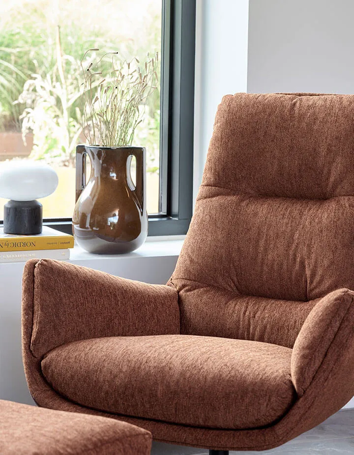 Die Designsprache von Sessel MORO ist eine Hommage an Weichheit und Komfort. Die feste Schale kombiniert mit einer weichen Kissenpolsterung verleihen dem Sessel unglaubliche Gemütlichkeit und einen einzigartigen Look. Dank seines Komforts, seines schönen Designs und seiner Langlebigkeit findet MORO problemlos in jedem Raum seinen Platz. MORO kommt entweder mit einem Holzgestell daher - was ihm eine wunderbare Note hygge verleiht - oder als Drehsessel mit Metallgestell. Entscheide selbst, wie MORO bei dir einziehen darf. Der passende Hocker vervollständigt den Look und sorgt für optimale Entspannung.